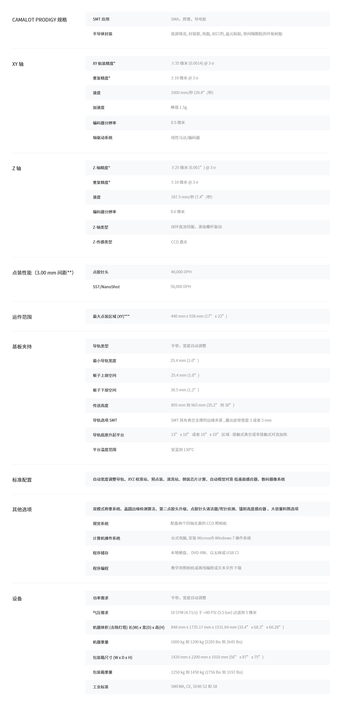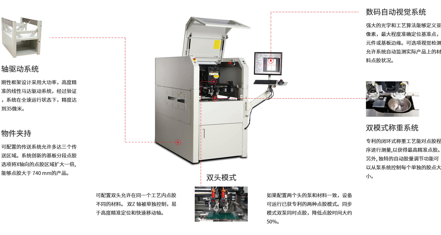 Prodigy 專為高速、高精度的點(diǎn)膠而設(shè)計(jì)和打造。Camalot 工程師們憑借超過 20 年在線性馬達(dá)和先進(jìn)的運(yùn)動(dòng)控制系統(tǒng)方面取得的經(jīng)驗(yàn),使加速度峰值達(dá)到 1.5g。 最先進(jìn)的 XY軸驅(qū)動(dòng)系統(tǒng)是新一代點(diǎn)膠的關(guān)鍵點(diǎn)。創(chuàng)新的剛性框架設(shè)計(jì)融合了先進(jìn)的線性驅(qū)動(dòng)結(jié)構(gòu)使點(diǎn)到點(diǎn)的移動(dòng)迅速,高精準(zhǔn)和長期的可重復(fù)性。